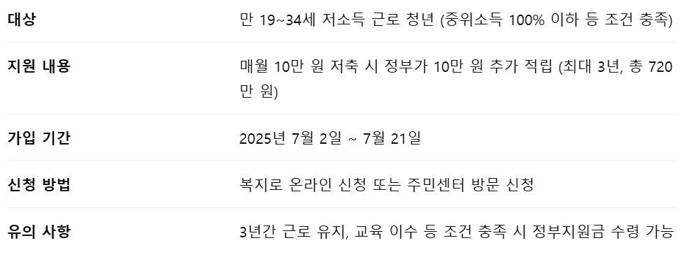 2025년에도 청년들의 자산 형성을 돕기 위한 대표 정책, ‘청년내일저축계좌’가 새롭게 문을 열었습니다. 보건복지부는 이달 7월 2일부터 21일까지, 청년내일저축계좌 신규 가입 신청을 받고 있습니다. 이 제도는 일하는 저소득 청년이 매달 일정 금액을 저축하면 정부가 매칭 지원금을 더해주는 방식으로 운영되며, 최종적으로 3년간 목돈을 마련할 수 있도록 도와줍니다.